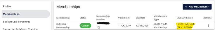 - USATF Membership: Prior to registering for Pacer Track Club, you must have an active membership with the USA Track and Field. You can register/renew at the USATF Membership Form. The cost is $37.10 and is in addition to Pacer Track Club fee of $110. As you register, you will be asked to validate your birth certificate. You also need to make sure to affiliate with the club. It should look like this: